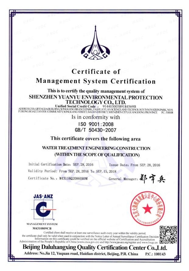 深圳市源禹環(huán)??萍加邢薰精@得ISO體系雙認(rèn)證。這是我們公司的的榮譽(yù)之一,,是企業(yè)對(duì)外交往時(shí)一張重要的“金名片”。 獲得國(guó)家級(jí)“ISO”的雙認(rèn)證是對(duì)我們?cè)从憝h(huán)保科技有限公司技術(shù)的高度認(rèn)可。
