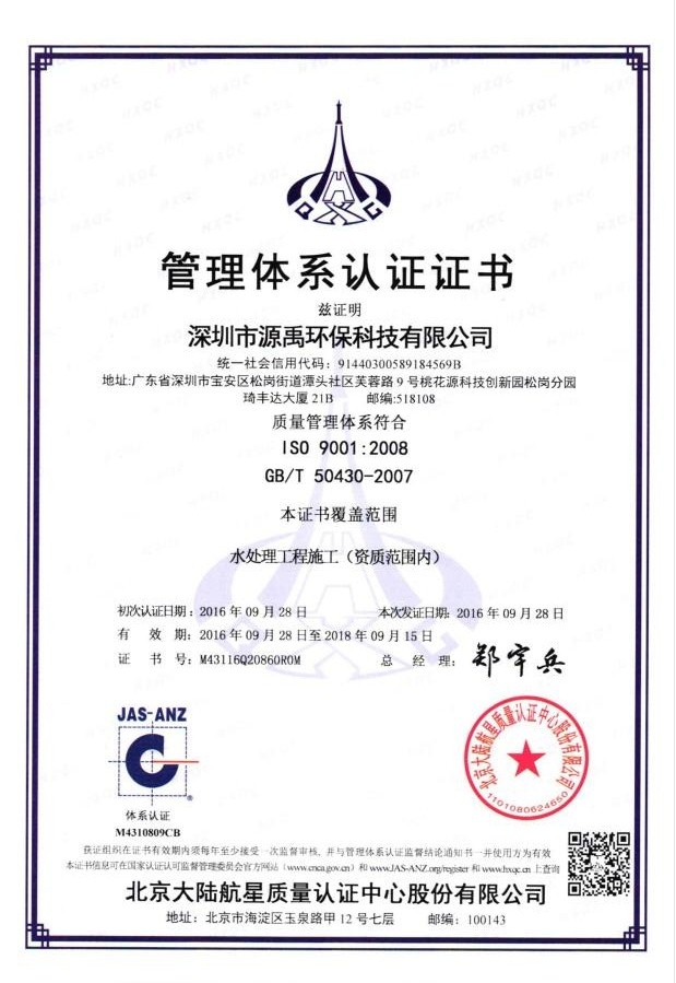 深圳市源禹環(huán)??萍加邢薰精@得ISO體系雙認證。這是我們公司的的榮譽之一,,是企業(yè)對外交往時一張重要的“金名片”。 獲得國家級“ISO”的雙認證是對我們源禹環(huán)??萍加邢薰炯夹g的高度認可。