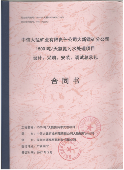 此次簽約中信大錳礦業(yè)有限責任公司1500噸/天高氨氮污水處理資源化綜合利用項目,實際在本項目中使用專利技術(shù)。是一種通用的高濃度氨氮廢水資源化處理的方法,達到國家廢物利用回收環(huán)保排放標準(15mg以下)真正地減少了污染,產(chǎn)生了可觀的經(jīng)濟效益,為我公司在錳行業(yè)環(huán)保合作創(chuàng)立了良好基礎(chǔ)。