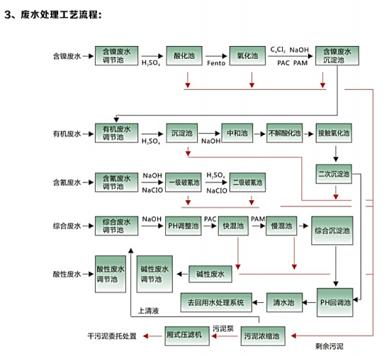 根據(jù)生產(chǎn)的性質(zhì)及工藝流程,廢水主要為電鍍廢水,包括:含鎳廢水、綜合廢水,含氧廢水、有機(jī)廢水.主要的污染物為 鎳、銅、錫、氰、磷酸鹽和有機(jī)污染物.視生產(chǎn)工藝的不同,部 分線路板廢水中有時還包括絡(luò)合銅廢水、含鉻廢水、顯影脫模廢水,根據(jù)現(xiàn)場生產(chǎn)工藝和泉鎰興電子科技(深圳)有限公司申明, 本項目廢水中沒有包括上述三種廢水及含鉛廢水.公司原管路進(jìn) 行了分流,但不能適應(yīng)新的系統(tǒng).本項目完成后,必須配套進(jìn)行 工藝廢水排放管路的整改,嚴(yán)格區(qū)分不同的廢水,單獨排入廢水 處理站.廢槽液均不直接進(jìn)入廢水處理系統(tǒng),必須建立廢液收集系統(tǒng)(不包括在方案內(nèi)),收集后直接交環(huán)保部門處理.